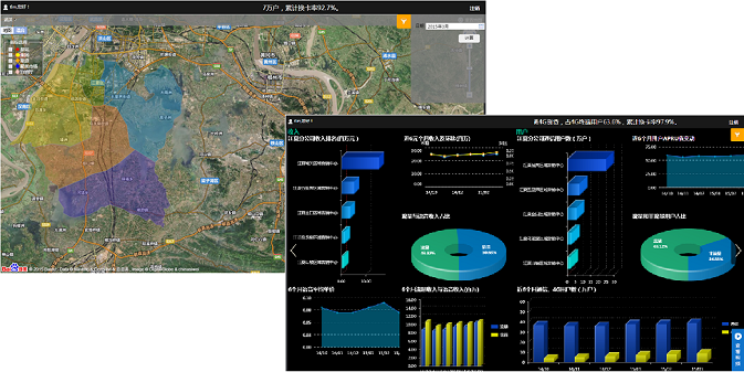 基于GIS地圖的沙盤式管理理念,依托于百度地圖的地理信息,結合武漢移動已有的業務數據,億信BI實現了對武漢移動各區域市場、企業客戶、渠道網點的集中管理和實時監控,真正實現了企業的沙盤式管理思想。