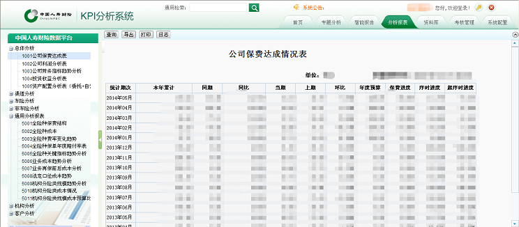 提供總體分析,渠道分析,車險分析,非車險分析,通用分析,機構分析,客戶分析等數(shù)據(jù)分析服務。對保費、利潤、成本、預算、收益等指標進行匯總統(tǒng)計。通過BI數(shù)據(jù)服務平臺完成以上統(tǒng)計分析報表的設計與制作,并將這些報表集成到中國人壽財險的業(yè)務平臺,在中國人壽財險業(yè)務平臺統(tǒng)一展現(xiàn)。