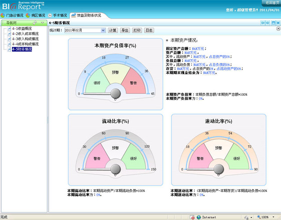 對于平均住院日及病床使用率等關鍵指標,我們通過儀表盤的方式進行展現,通過與目標值的比較得出關鍵指標是否達標,并通過儀表盤上指針的指向能夠快速獲得關鍵指標的達標信息。