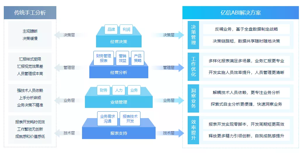 作為國內(nèi)最早深耕BI領(lǐng)域的軟件公司,億信華辰致力于為政企客戶提供一站式數(shù)據(jù)分析平臺,此次獲獎的億信ABI滿足用戶從數(shù)據(jù)填報、ETL數(shù)據(jù)處理、數(shù)據(jù)建模到數(shù)據(jù)分析、數(shù)據(jù)可視化、移動應(yīng)用等各個環(huán)節(jié)的功能需求,覆蓋數(shù)據(jù)分析完整流程,幫助用戶實現(xiàn)更深入的業(yè)務(wù)洞察力。