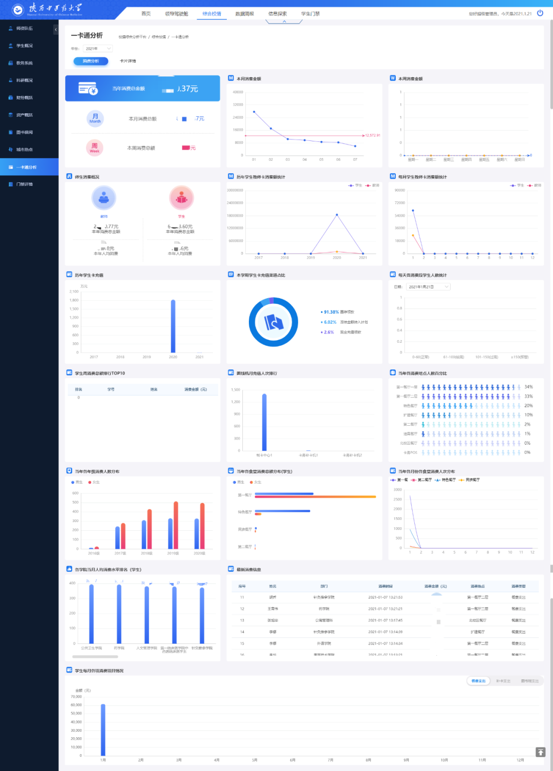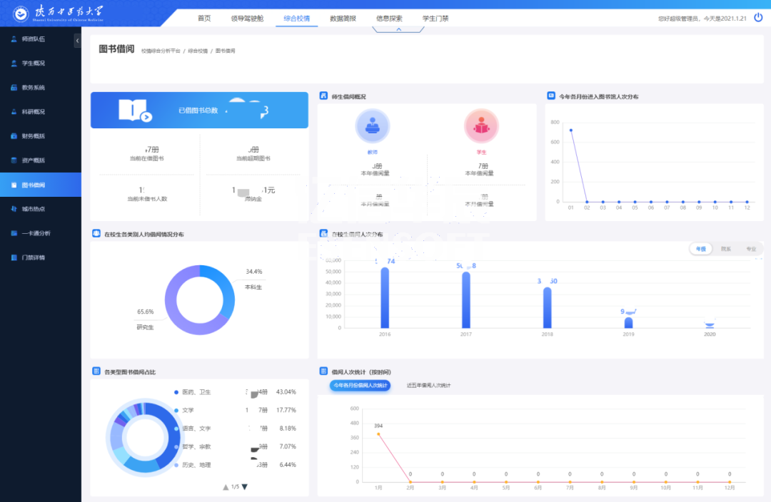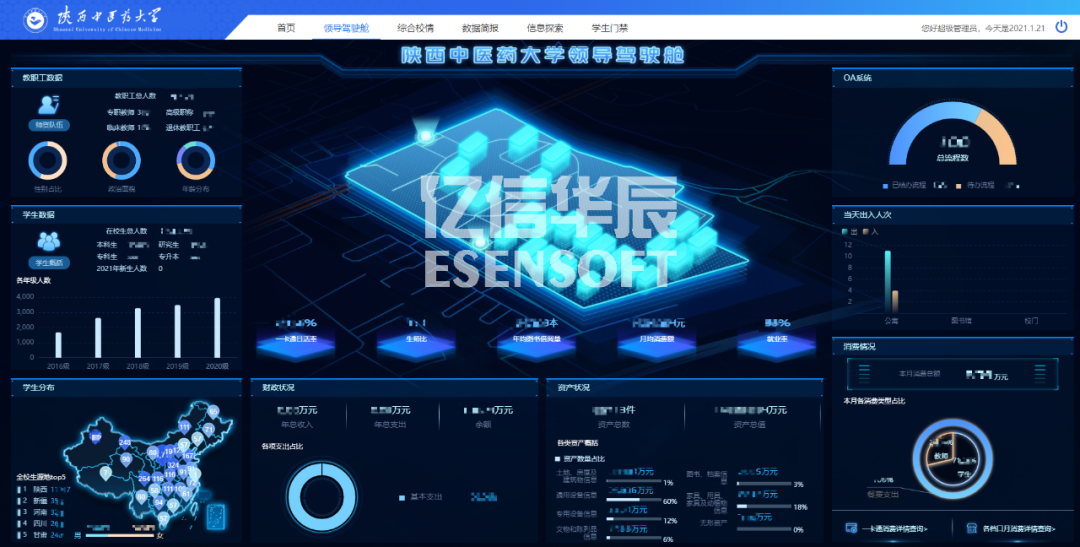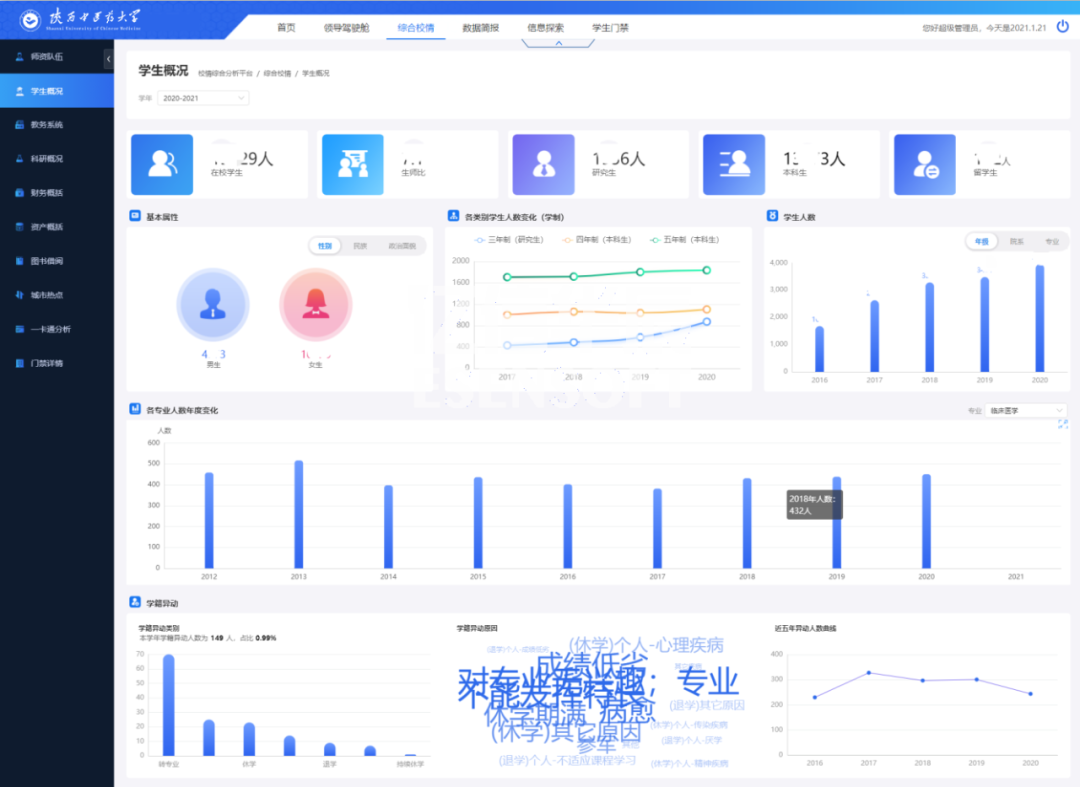 陜西中醫藥大學利用億信ABI建設了統一的校情綜合分析平臺,涉及內容包括首頁、領導駕駛艙、綜合校情、數據簡報、信息探索和學生門禁等各項內容。通過數據化運營改進數據收集和管理方式,用數據驅動業務,對業務數據進行可視化分析,以提升學校管理水平和服務能力。