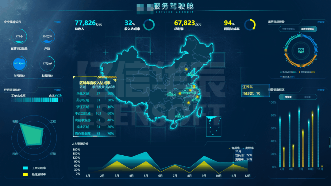 經常有朋友抱怨,想做可視化大屏,但覺得好難。我說,有個好工具很重要。 想快速做出一個數據大屏,當然離不開可視化組件。你離高大上的大屏只差一個億信ABI,簡單拖拽組件,替換業務數據,輕輕松松搞定酷炫大屏。 億信ABI的酷屏分析內置了數十套大屏模板,直接套用, 酷炫大屏一鍵生成。當然還有布局、表格、統計圖、地圖、參數等九大類型百余種組件,不論是單看還是組合在一起都能讓你的大屏熠熠生輝。 除了這些組件,工程獅還開發了新一波的組件,讓你利用這些大屏組件,快速開發數據大屏。 01主視覺圖表 主視覺圖表作為大屏的視覺中心,一般放在中間位置,用于呈現核心指標和重要信息,通常帶有炫酷的動效,給人帶來視覺的震撼效果。中國地圖